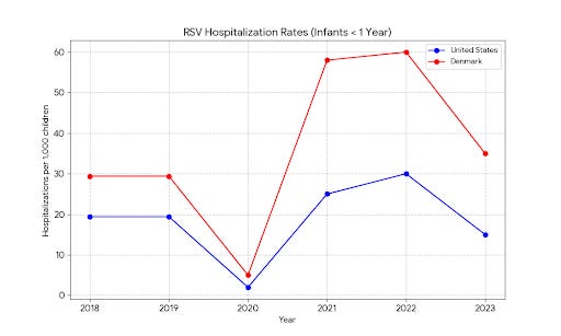 Although Denmark’s healthcare system far exceeds that in the United States, RFK Jr. and Donald Trump have ignored one important fact. Independent of the level of hygiene in the home, sanitation in the country, general health of the population, or access to a healthcare, certain diseases, for instance rotavirus, RSV, influenza, and Covid-19, will infect virtually all children by 10 years of age. Every year, about 1,200 children in Denmark are hospitalized with severe dehydration caused by rotavirus infection. And every year, more than 2,800 children in Denmark, mostly less than 6 months of age, are hospitalized with pneumonia caused by RSV. Accounting for differences in size of the countries, these figures are virtually identical to those found in the U.S. before vaccination. In the United States, a routine rotavirus vaccine recommendation in 2006 has virtually eliminated the 70,000 hospitalizations caused by rotavirus every year. During the past year, routine recommendations for a maternal RSV vaccine and an RSV-specific monoclonal antibody has reduced the 60,000 to 80,000 RSV-associated hospitalizations in infants less than 7 months of age by about 50 percent.